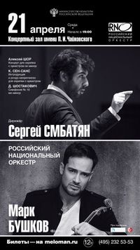 21 апр 19:00 Russian National Orchestra Дирижер: Sergey Smbatyan (Armenia) Solista: Marc Bouchkov violin (Russia) Tchaikovsky Concert Hall, Moscow State Tchaikovsky Conservatory
